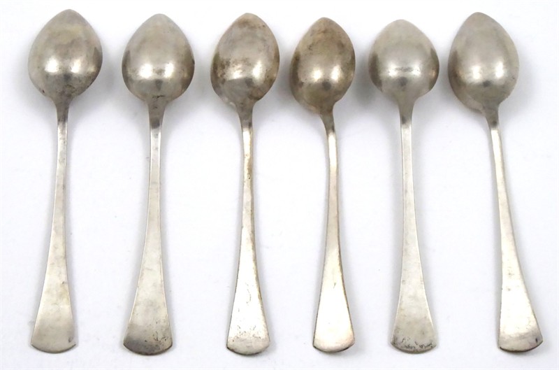 Stříbro. Období a styl: art deco. Ryzost Ag 800/1000, celková hmotnost 71,12 g. Šest art deco kávových lžiček s fazetovanými okraji rukojetí, jež jsou elegantně vějířovitě ukončené. Značeno: československý punc Tatry, ryzost 800 a mistrovská značka. Československo 1929 - 1941. Délka 11 cm.