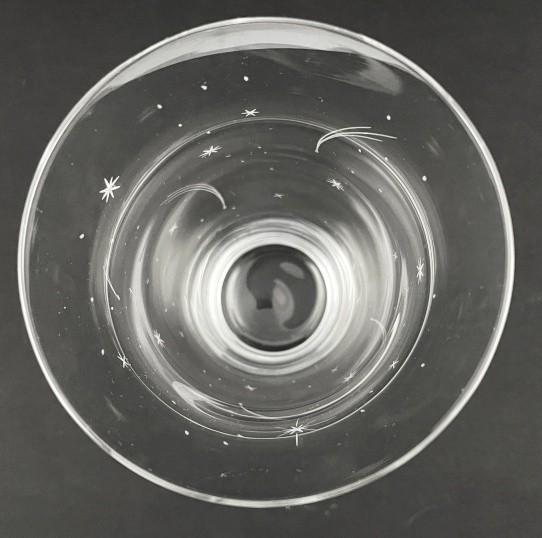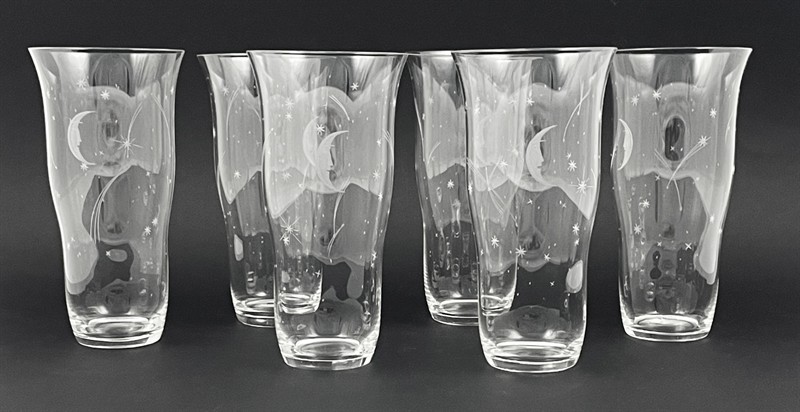 Bezbarvé ručně broušené tenkostěnné sklo. Období a styl: art deco a prvky vídeňské secese. Haida (Nový Bor) nebo Steinschönau (Kamenický Šenov) nebo Alois Metelák (1897-1980) spolu se studenty tehdejší Státní odborné sklářské školy v Železném Brodě. Ovlivněno tvorbou slavného vídeňského architekta a designéra Josefa Hoffmanna (1870-1956). Zvláště jeho návrhy mušelínového nápojového skla pro firmy J. & L. Lobmeyr, které byly často vyráběny v Čechách. Sada šesti vysokých sklenic na nápoje organického tvaru zdobené ručně broušenými hvězdičkami, letícími kometami a měsícem. Ve výborném stavu. Čechy 1925 - 1935. Výška 18 cm.