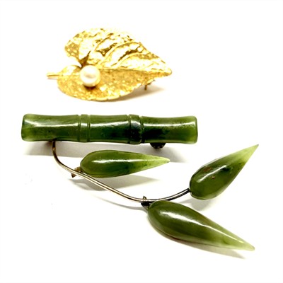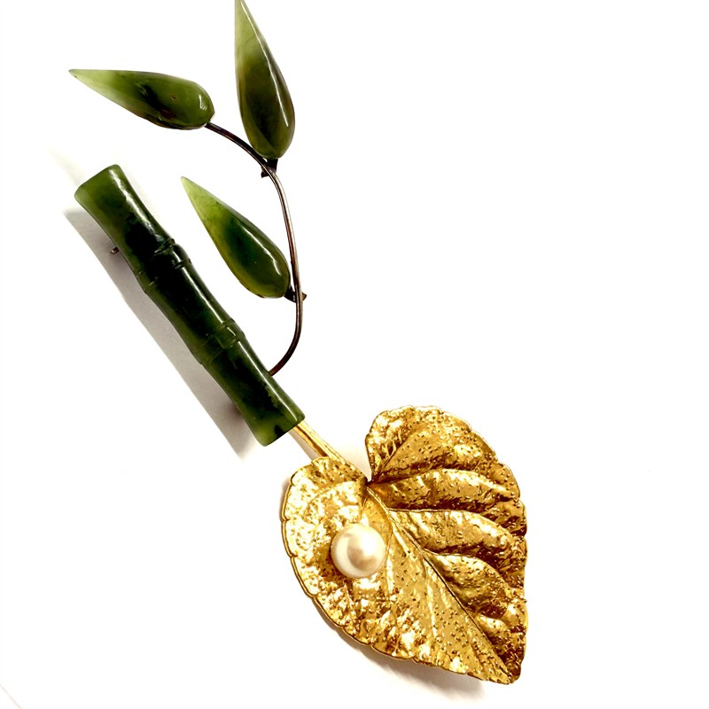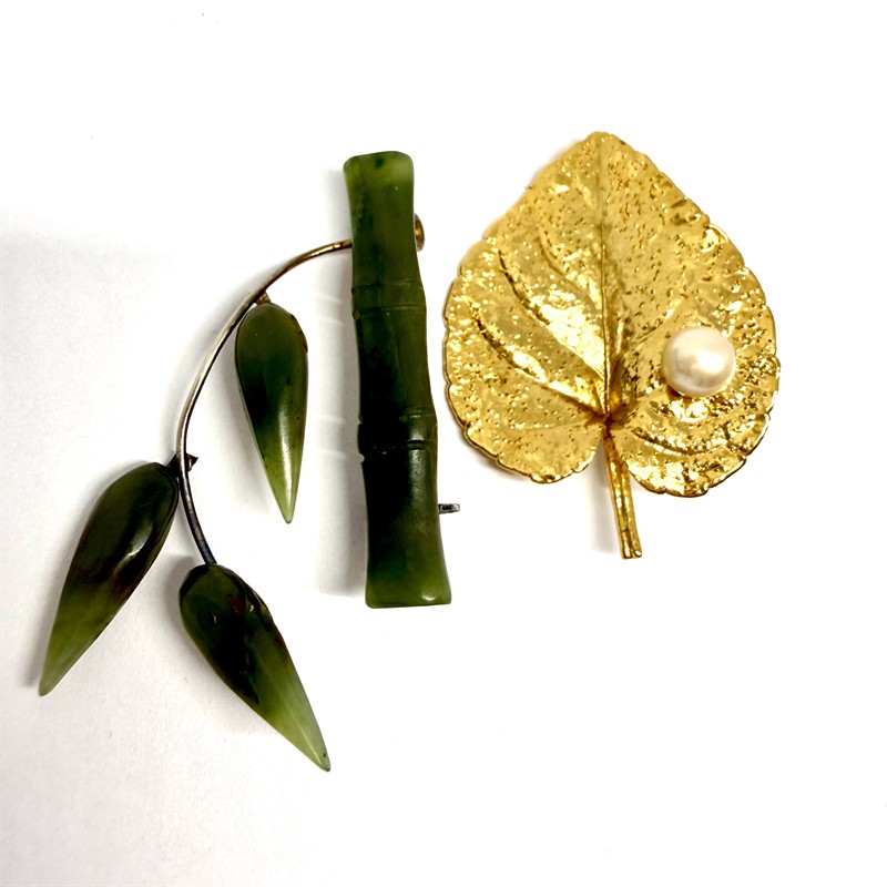 Set dvou půvabných broží s motivem listů. Jedná se o větévku bambusu s listy. Šperk byl zhotoven z jadeitu svěžího zeleného odstínu a kovu. Rozměry cca 4 x 3 cm. Druhá brož - věrně, detailně ztvárněný list ze silně zlaceného kovu zdobený bílou perlou. Rozměry cca 4,5 x 3 cm.