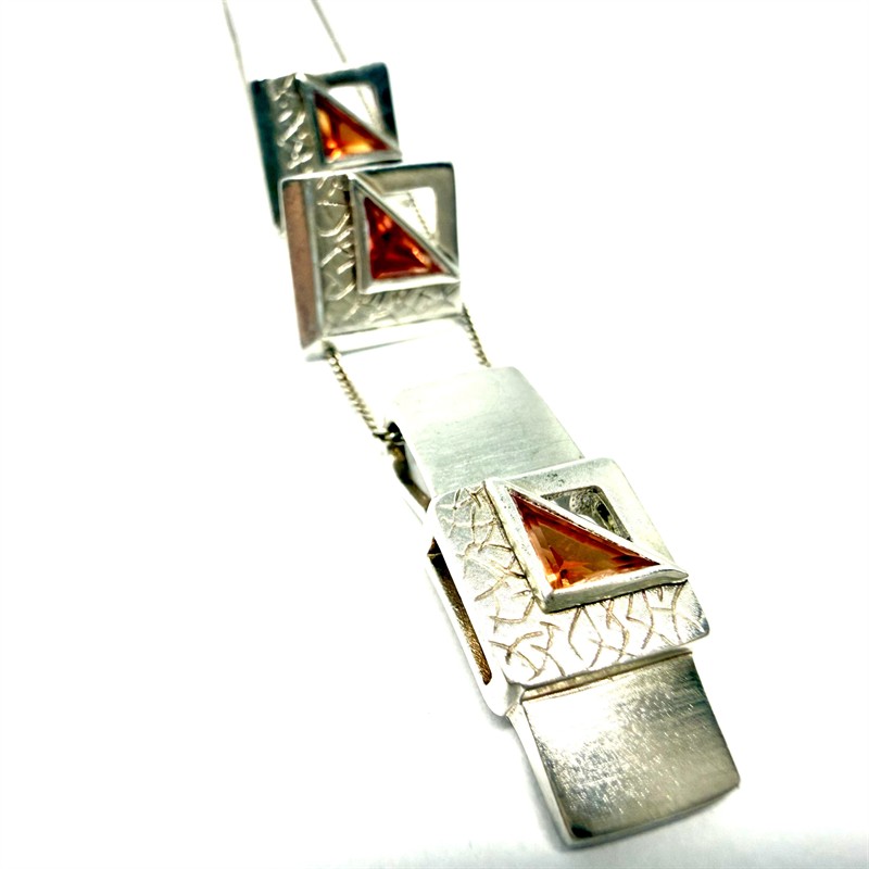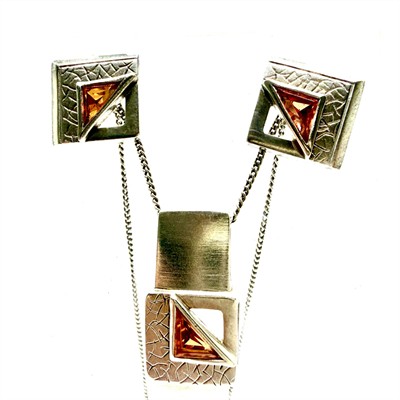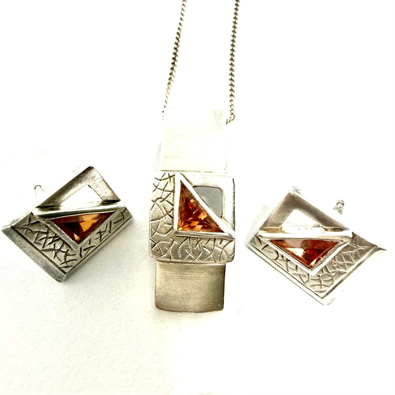 Set originálních šperků - náušnice a náhrdelník. Špeky byly zhotoveny ze stříbra sterlingové ryzosti (925/1000). Celková váha kompletu 8,04 g. Osazeno syntetickým safírem půvabného oranžového odstínu. Zapínání náušnic na puzetu. Délka řetízku 42 cm. Rozměry náušnic 1,1 x 1,1 cm. Rozměry závěsu 2,6 x 0,8 cm. Šperky jsou v perfektním stavu.