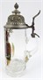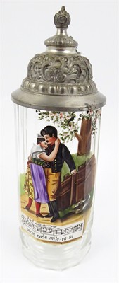 Čiré ručně broušené sklo, ruční malba emailem, cín. Korbel z čirého skla ručně broušený do svislých fazet. Centrální scenérie mileneckého páru v dobovém oděvu stojícího pod kvetoucím stromem a dole notový zápis s písní Věrné naše milování. Cínový úchyt zdoben na vrcholu listy a plody dubu, zdobně ryté cínové víko korbelu korunované rovněž žaludem. Čechy 1870 - 1910. Výška 24 cm.