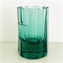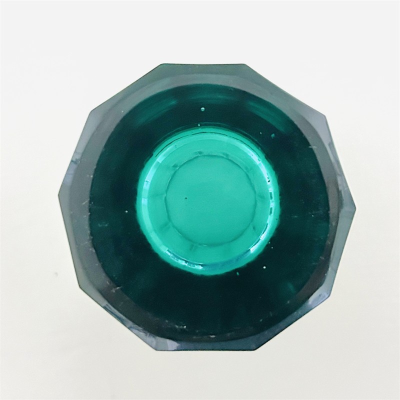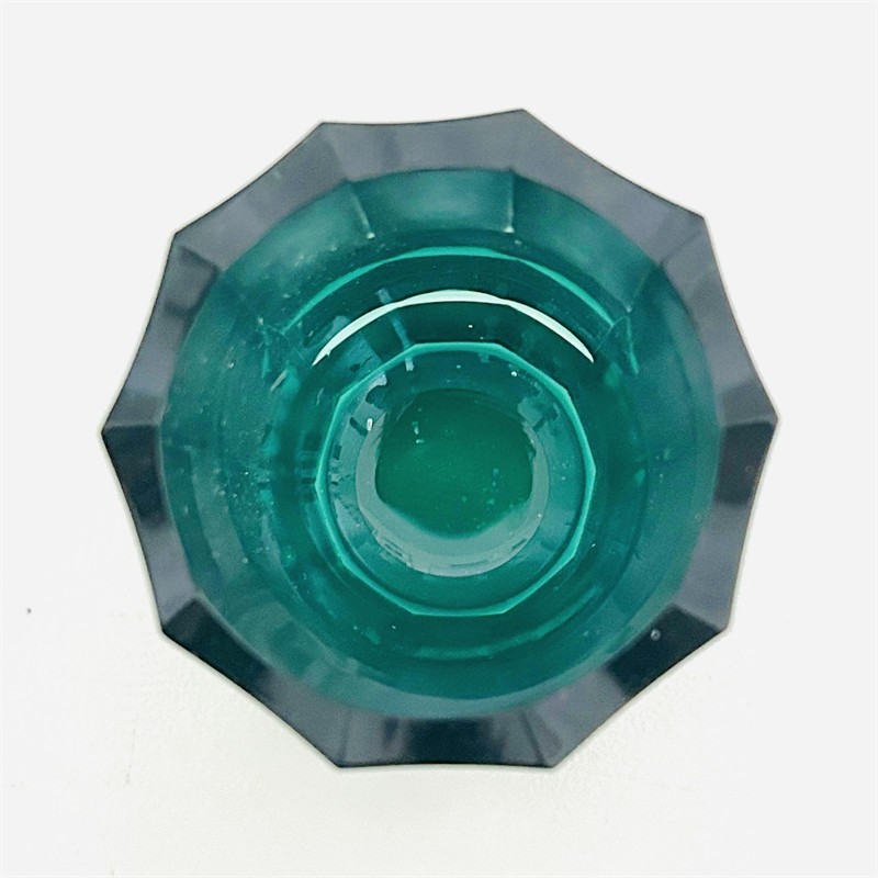 Dekorativní pohár ze silnostěnného petrolejově zeleného skla, obvod broušený do fazetovaných pásů, zepředu zaoblená prázdná obdélná kartuše pro případný monogram či rytou dedikaci. Horní okraj s obloukovým probroušením, zespoda vybroušený čočkovec. Nadčasový design odvozený od produkce sklárny Moser, patrně tuzemská práce z 20. až 30. let 20. století. Výška 10 cm, průměr 6,5 cm. Ve velmi zachovalém stavu.
