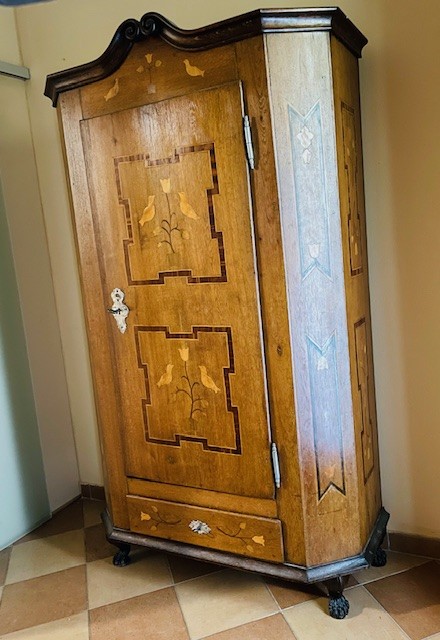 Jedno dveřová skříň intarzovaná motivy ptáčků a květů. Z poloviny 18. století. Rozměry : 182x113x44 cm. V hezkém stavu. Používaná jako šatní skříň. Doprava na domluvě.