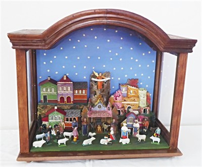 Dřevořezba, polychromie, sklo, ruční malba. Přiloženo osvědčení Národního památkového ústavu České republiky. Betlém s největší pravděpodobností pocházející od neznámého autora z Třešti, Horácko (souzeno dle stylu malby architektur). Dřevěná skříňka štenýřové konstrukce s plnými přikolíkovanými zády vpředu zvednutá do skládaného oblouku. Boční stěny tvoří do lišt vsazená skla moderního typu floatglas (nerozbalovaná). Centrální scénu představuje chlév s jesličkami. Dále řezané, polychromované figurky, vlevo například sv. Josef, vpravo Panna Maria a Tříkrálový průvod. Vše volně doplňují ovečky. Na věži anděl (tzv. gloriák, zvěstovatel) s nápisem: "Gloria in excelsis Deo" (Sláva na výsostech Bohu). Modré pozadí poseto bílými hvězdičkami. Velmi zachovalý stav. Morava, Horácko, Třešť, konec 19. století. Rozměr betlému: 56 cm x 64 cm x 32 cm.