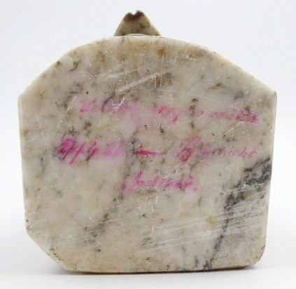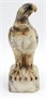 Mramor, ruční malba pařátů, černým sklem vykládaná oka dravce. Mramorová figura sokola s hlavou otočenou do strany. Vsazená skleněná černá očka a ručně malované pařáty. Na nepravidelném stylizovaném podstavci. Zespodu nečitelné červeně psané přípisy. Evropa 1890 - 1930. Výška 21 cm.