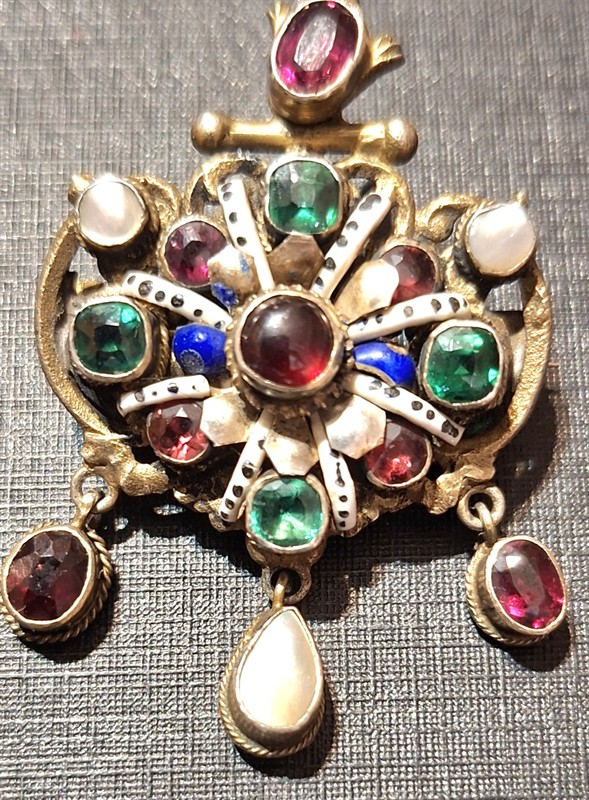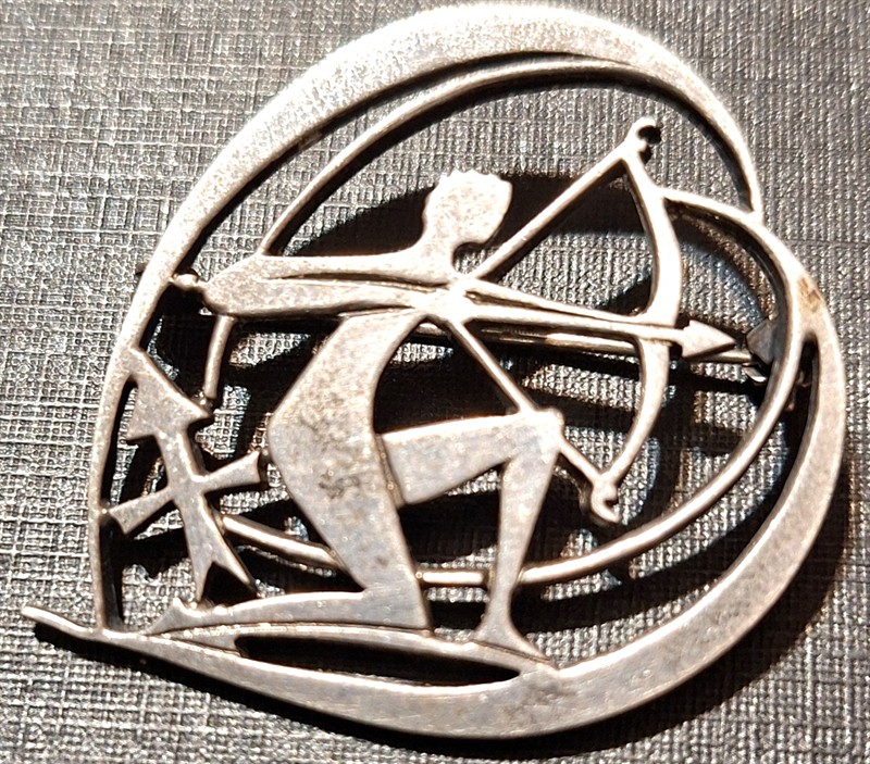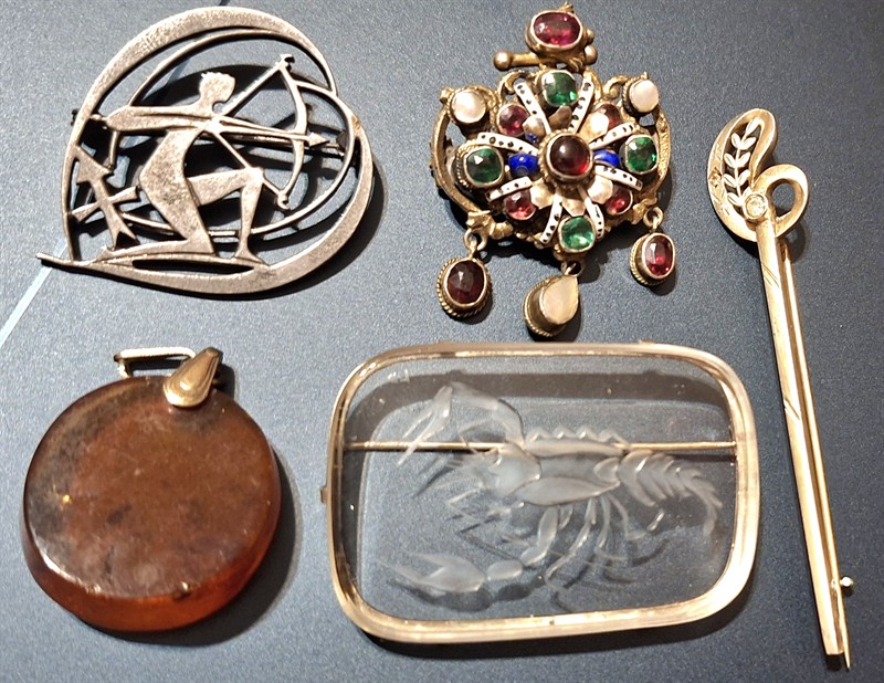 Stříbrná brož – medailon se znamením střelce, stříbro ryzost 800/1000, hmotnost 8,8 g, rozměr 3,5 x 4 cm, , značeno K & L – firma Kordes & Lichtenfels (K&L) Německo, art deco 30 léta Jantarový přívěsek se stříbrným očkem, stříbro ryzost 875/100, puncováno sovětským a československým dovozovým puncem, Kaliningrad SSSR, průměr asymetrického jantarového medailonu 2,5 – 2,8 cm Stříbrná brož pozlacená s kamínky, stříbro 900/1000, jehla a její uchycení z ok, rozměr 7,7 x 1,5 cm, celková hmotnost 6,5 g, art deco 20. léta m.s. Velká brož s rytinou raka, sklo, obecný kov, 5 x 3,5 cm, hmotnost 24 g,, art deco 20. léta m.s., 20. léta m.s, art deco Zlacená brož – přívěs s barevnými kameny a perletí, pravděpodobně Sedmihradsko 19. století, žlutý kov (tombak ?), rozměr 5 x 3,5 cm, hmotnost 16 g, pravděpodobně Sedmihradsko 19. století, výborná zachovalost