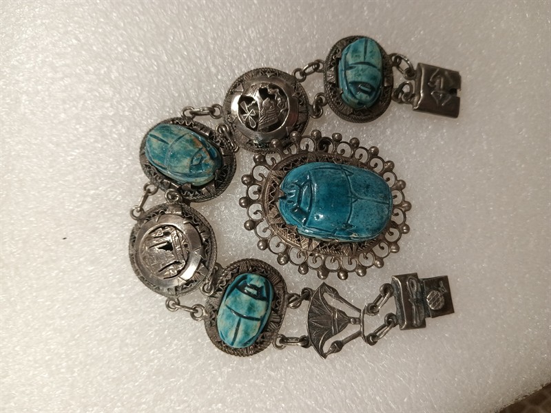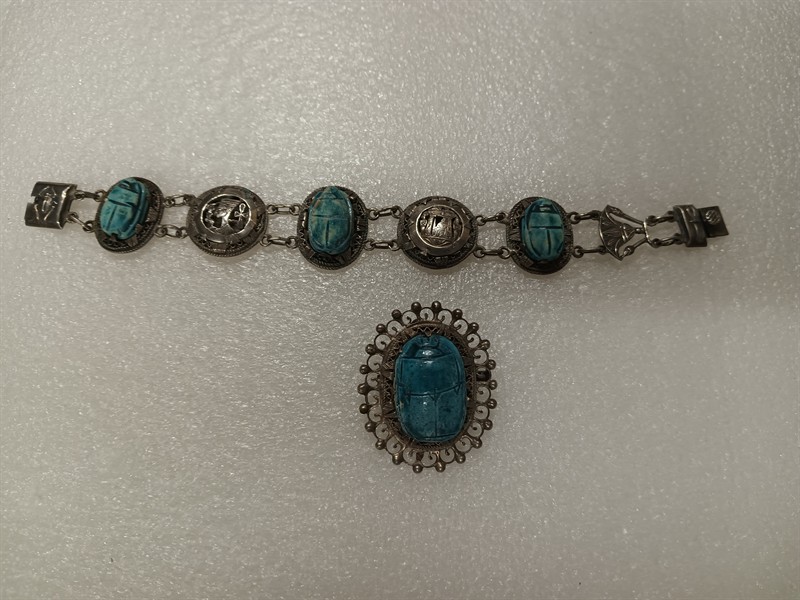 Souprava vyrobena ze stříbra ryzosti 800/1000 ( platné puncovní značky) - s motivem scarabeů . Náramek má délku 19 cm , šířku 2,3 cm . Náhrdelník, který je díky sponě možný nosit jako brož má rozměry 4,2 x 3,5 cm .Celková hmotnost 47,58 gr