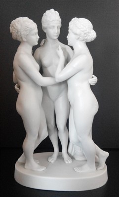 Sousoší tři grácie, bílý biskvitový porcelán, signováno, výrobce německá porcelánka Porzellanfabrik Hertwig & Co., která byla založena v roce 1864, styl Art Deco, vyrobeno ve 20. letech minulého století, výška 19 cm, oválná podstava má rozměry 11,5 x 6,5 cm, naprosto perfektní stav, bez sebemenšího poškození. Krásný nadčasový artefakt.