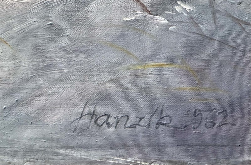Olej na plátně napnutém na klipnkovém rámu o velikosti 45 x 70 cm. Signováno vpravo dole “ Hanzík 1962”. Rámováno v zajímavém bílozlatém rámu.