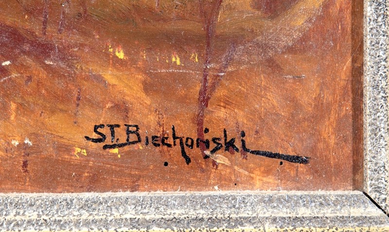 Olej na dřevě o velikosti 47 x 49 cm, signováno vpravo dole, rámováno. Stanislaw Biechoňski (1902-1975) byl polský malíř pocházející ze Lvova. Byl úzce spjatý s místní uměleckou scénou, vystavoval na souborných výstavbách TPSP, v Muzeu Malczewskiego především Tatranské motivy.