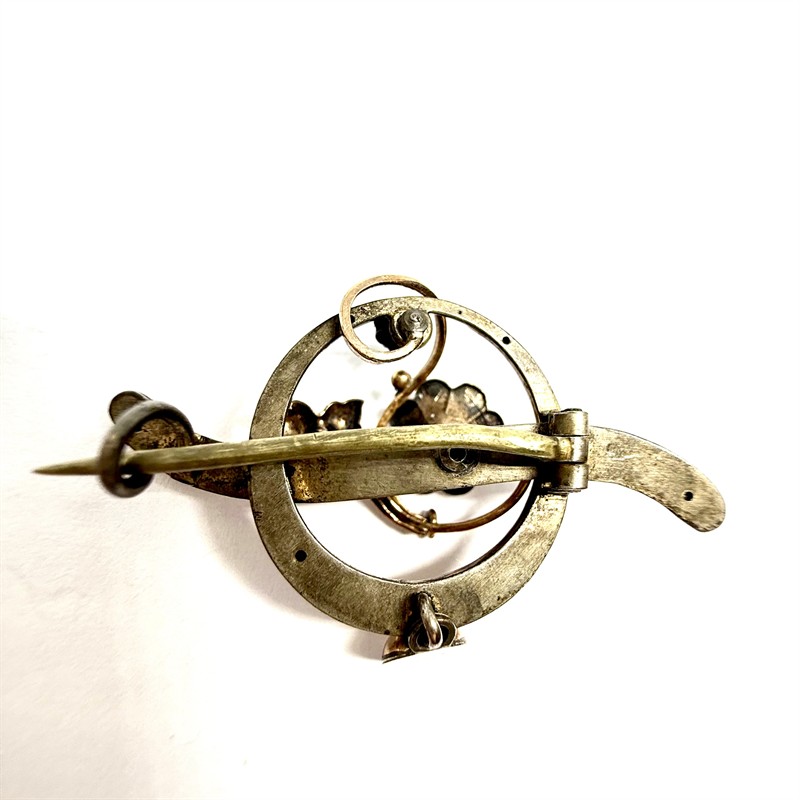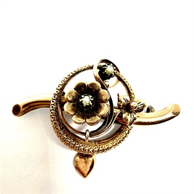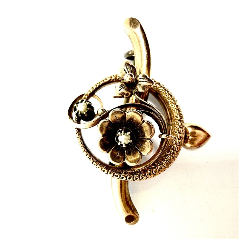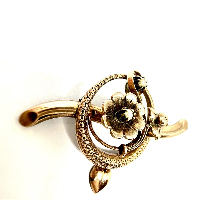 Velmi půvabná, stará brož ze silně zlaceného kovu -tzv. double. Šperk nesoucí jemný florální motiv je zdoben říčními perlami a kinetickým srdcovým ověsem a byl vyroben na konci 19.století. Rozměry cca 3,5 x 3 cm. Výborný stav.