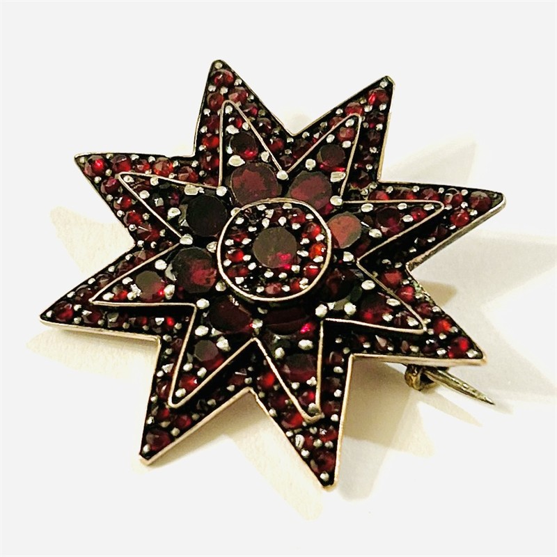 Starožitná brož ve tvaru honosné osmihroté hvězdy, v několika stupních osazeno českými granáty kulatého plochého a routového brusu, efektní kontrast větších (až 4 mm!) a drobných kamenů. Kameny mají jiskrnou barvu, fasováno nýtkovou technikou. Precizní tuzemská granátnická práce z 80. let 19. století s reflexí dobového pseudorenesančního stylu. Zasazeno ve slitině tombaku; neznačeno. Hmotnost 6,12 g, délka 34 mm. Zapínání na "C" sponu v pořádku, opravované zapínání, některé kameny doplněny jinými druhy přírodních granátů a brusů, vyčištěno a restaurováno Monikou Zemanovou, DiS., celkově v zachovalém stavu.