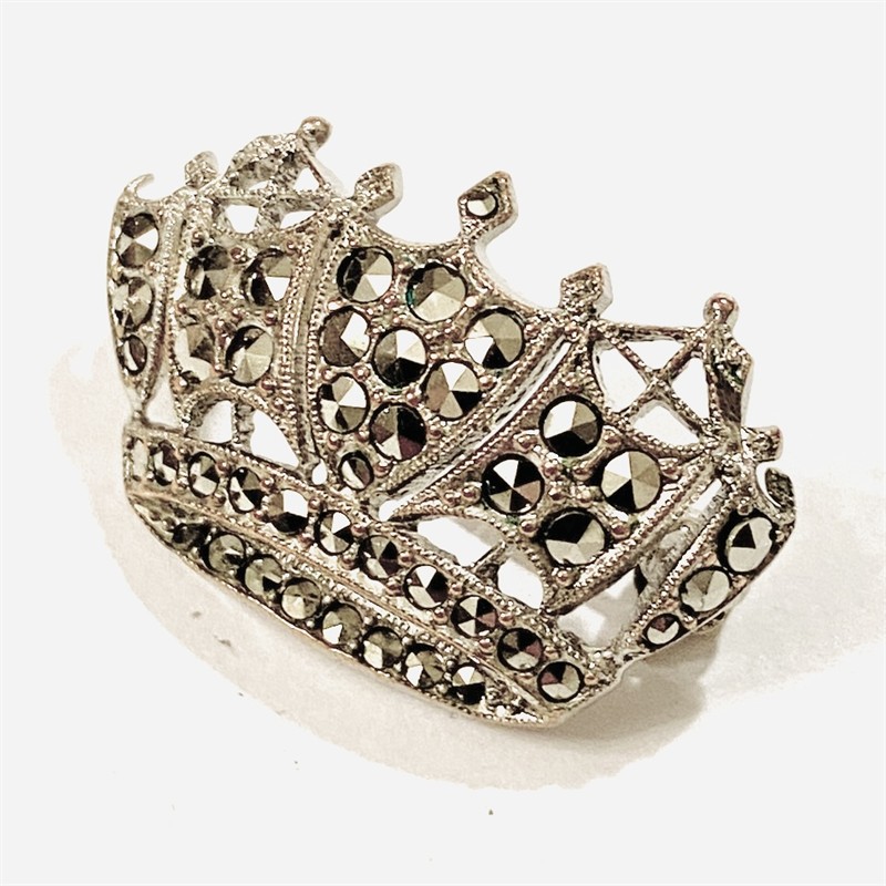 Nápaditá, blyštivá brož ve tvaru královské koruny, v pavé osázeno přírodními markazity kulatého hvězdicového brusu, bohatě prořezáváno, okraje zušlechtěny zrnkováním (milgrain). Kvalitní západoevropská šperkařská práce z 2. třetiny 20. století. Zhotoveno ze stříbřitého obecného kovu; neznačeno. Hmotnost 4,11 g, délka 27 mm, šířka 17 mm. Zapínání v pořádku, včetně pojistky, celkově v zachovalém stavu.