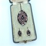 Starožitná souprava s českými granáty, v původní etuji, brož a náušnice, Čechy, 19. století, český granát plochého výbrusu, tombak rozměry brože 4 x 2,3 cm, délka náušnic 2 cm