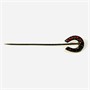 Elegantní, větší jehlice s hlavicí ve tvaru podkovy, která je tvořena stupňovitě velkými českými granáty kulatého plochého brusu, fasováno nýtkovou technikou, kameny opatřeny průsvitkami. Variabilně nositelný šperk do kravaty/šátku či klopy, s oblíbeným motivem štěstí. Tuzemská granátnická práce z konce 19. století. Zhotoveno z tombaku; neznačeno. Hmotnost 2,00 g, celková délka 13 cm, hlavice 17 mm, šířka 14,5 mm. Ponecháno s přirozenou patinou, lze vyčistit, ve velmi zachovalém stavu.