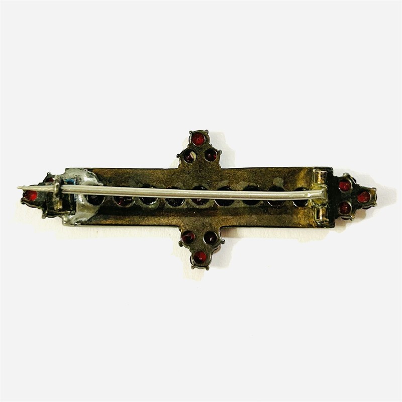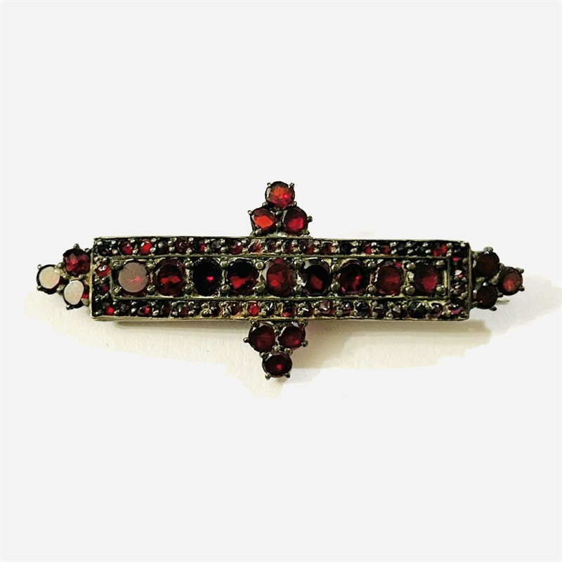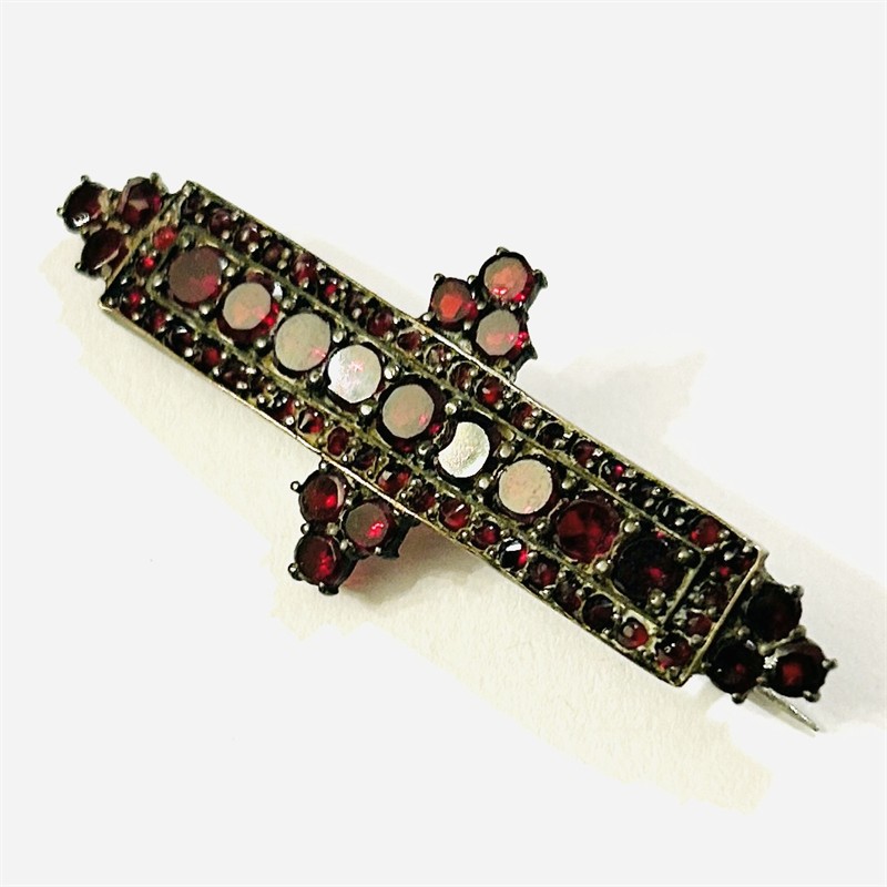 Starožitná brož v novorenesančním stylu, osázeno českými granáty, středový pás a ozdobné výstupky kulatého plochého brusu, rámováno kontrastně menšími kulatého routového brusu, fasováno nýtkovou a zrnkovou technikou, větší kameny opatřeny průsvitkami. Precizní tuzemská granátnická práce z 80. let 19. století. Reflexe dobových pseudoslohů v granátovém šperkařství je méně častá i díky tomu se jedná o sběratelsky zajímavý kousek. Zasazeno ve slitině tombaku. Hmotnost 5,09 g, délka 50 mm, šířka 20,5 mm. Zapínání na "C" v pořádku, v minulosti zezadu opravováno (při nošení není vidět, nečištěno, ponecháno s přirozenou patinou, celkově v zachovalém stavu.