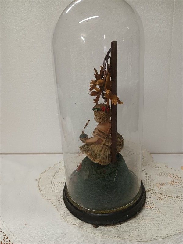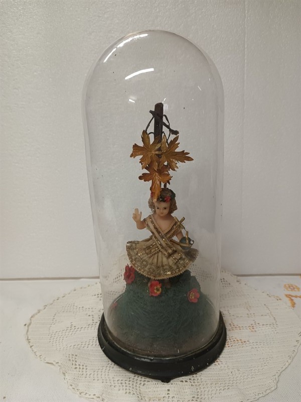 Starožitná socha pod skleněným šturcem - Pražské Jezulátko, socha je vyrobena z vosku. Výška 36 cm .