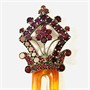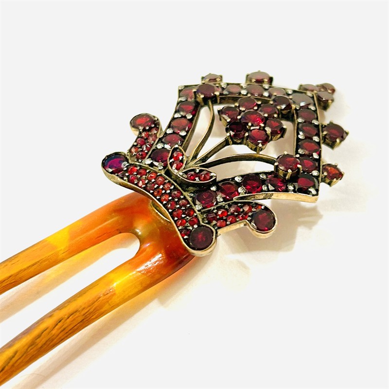 Honosná, dekorativní spona do vlasů, hlavice v historizujícím tvarosloví s ústředním motivem květiny, osázeno kontrastně velkými českými granáty kulatého routového a kulatého plochého brusu, největší o nadstandardním průměr více než 4 mm (!), fasováno nýtkovou a zrnkovou technikou, větší kameny opatřeny zespod průsvitkami. Dvouzubý zápich z umělé hmoty imitující želvovinu, hlavice připevněna na ohebném pantu, díky kterému lze přiléhavě zakomponovat do účesu. Precizní tuzemská granátnická práce z 80. let 19. století. Zasazeno ve slitině tombaku; neznačeno. Hmotnost 9,75 g, celková délka 12 cm, délka hlavice 42,5 mm, šířka 32 mm. Pant v pořádku, celkově ve velmi zachovalém stavu, odborně vyčištěno zlatníkem.