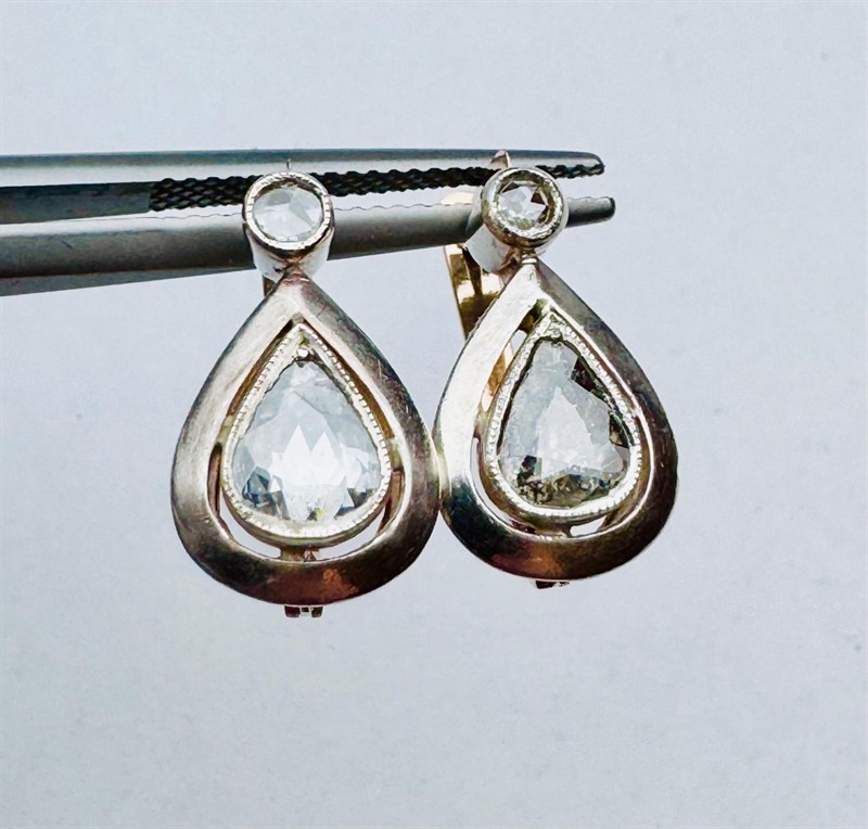 NÁDHERNÉ 14K ZLATÉ ZÁVĚSNÉ NÁUŠNICE S VELKÝMI DIAMANTY 2,00 CT - dvě kapky starého brusu a dva diamanty a o celkové váze cca. 1,70 ct, velikost velkých diamantů je cca. 6,5x,5,5 mm, každý cca. 0,80ct., rozměr náušnic je 20x10 mm, váha 4 gramů.