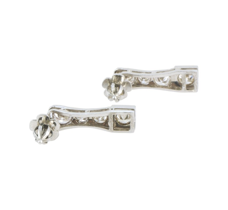 Starožitné Art Deco Náušnice z bílého zlata a platiny o ryzosti 585/1000 1,25 g a platiny 3,22g , osazené diamanty o celkové hmotnosti cca 2,40.ct. Délka náušnice je 2,2 cm. Celková hmotnost obou náušnic je 5,27 g, atest puncovního úřadu. Odborně vyčištěno zlatníkem.