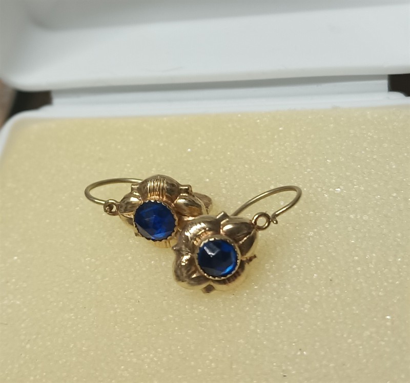 Krásné starožitné náušnice s modrými kameny , zlato 585/1000 Hmotnost 1,87 gr . Délka náušnic je 1,6 cm .