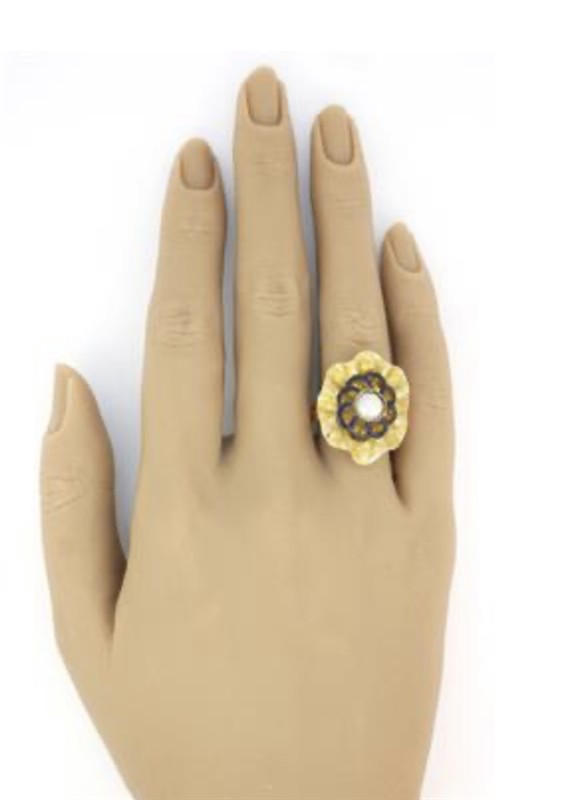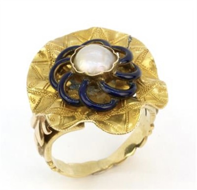 Starožitný Empírový prsten z počátku 19. století z dukátového zlata ryzosti 580/1000 zdobený perlou a modrým smaltem. Velikost prstenu 53. Celková hmotnost 7,40 g.