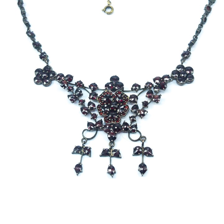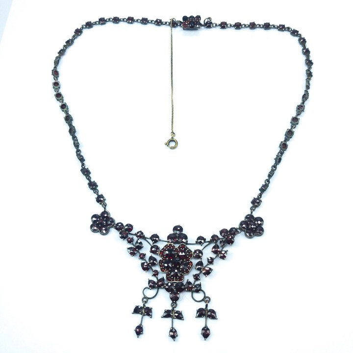 Starožitný granátový náhrdelník, Čechy, kolem roku 1880, český granát, tombak, délka náhrdelníku cca 41 cm tombak je tradiční slitina mědi a zinku v různém poměru, která se používala pro zasazování českých granátů v průběhu 19. století a to zejména pro svoji pevnost a odolnost, kdy se dobře zlatila a postříbřovala