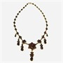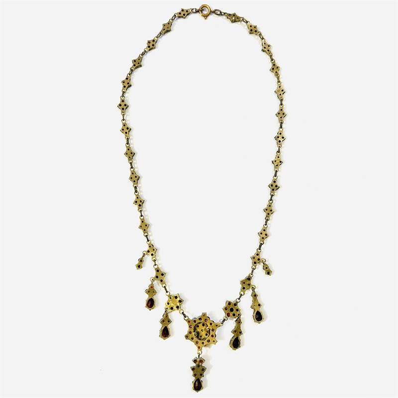Starožitný, honosný náhrdelník skládající se z článků, z ústředními ve tvarů květů osazených českými granáty kulatého plochého brusu, některé ověsky s přírodními almandiny kapkového brusu. Fasováno v krapnových lůžkách se spodními průsvitkami, díky kterým mají kameny jasnou barvu. Tuzemská granátnická práce ze 70. až 80. let 19. století. Zasazeno ve slitině tombaku; neznačeno. Hmotnost 14,39 g, délka 44,5 cm, nejdelší ověsek 40 mm, šířka článků 6 mm. Nepůvodní zapínání formou pérového kroužku v pořádku, nečištěno, ve zachovalém stavu.