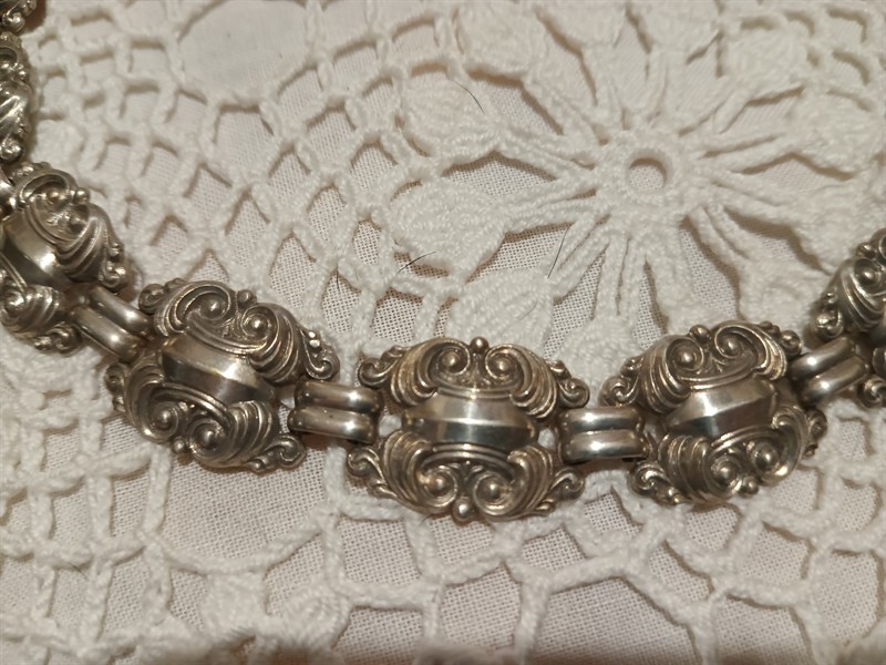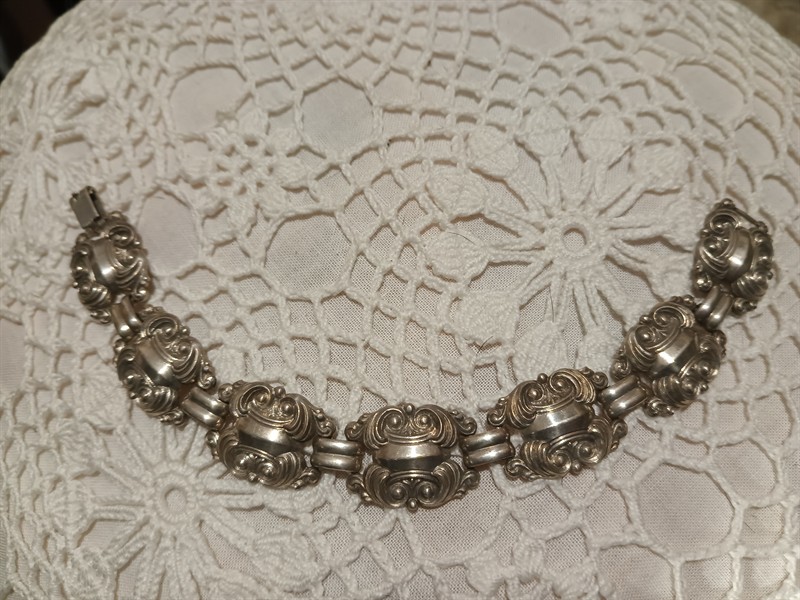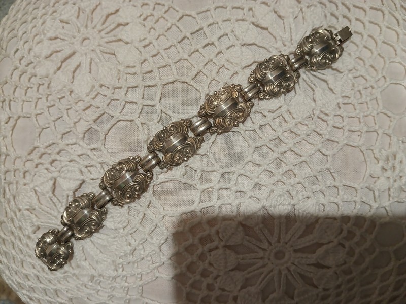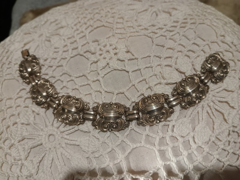 Krásný starožitný náramek vyrobený ze stříbra ryzosti 800/1000 . Délka náramku je 18 cm ( měřeno bez pojistky ). Šířka je 1,7 cm . Hmotnost 27,48 gr . Přiložena boleta Puncovního úřadu.