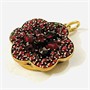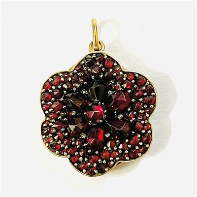 Starožitný přívěšek sloužící i jako medailon na fotografii, tělo ve tvaru šestilistého květu, v pavé osázeno kontrastně velkými českými granáty kulatého a kapkového routového brusu, fasováno nýtkovou technikou a krapnami. Precizní tuzemská granátnická práce ze 70. až 80. let 19. století. Zasazeno ve slitině tombaku; neznačeno. Hmotnost 3,57 g, celková délka 27 mm, šířka 19 mm. Pantový mechanismus v pořádku, celkově v zachovalém stavu, odborně vyčištěno restaurátorem.