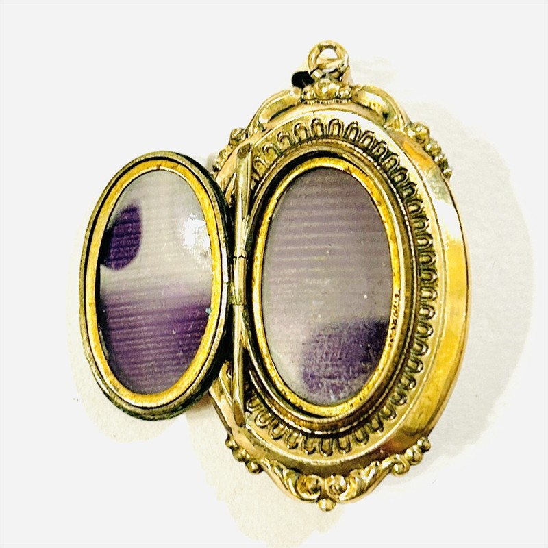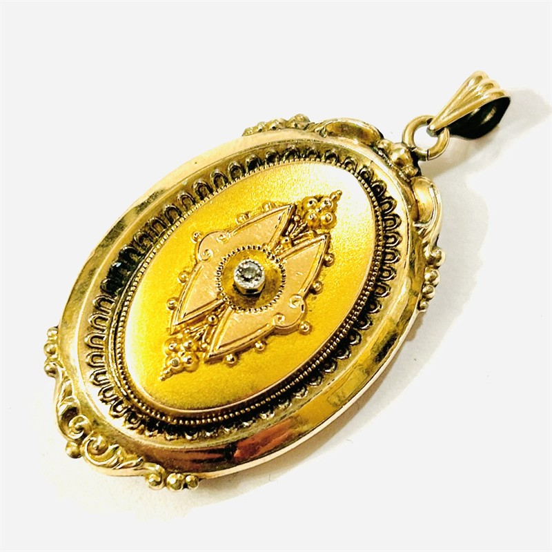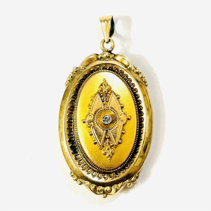 Honosný přívěšek sloužící i jako medailon na fotografie, oválně tělo bohatě plasticky tvarováno a dekorováno ve stylu pozdního biedermeieru. Frontální část v kontrastním lesklém a matovaném zlatavém odstínu, ve středu osazena v zrnité obrubě přírodním diamantem kulatého jednoduchého brusu o váze 0,03 ct, víčko při zadní straně zdobeno jemným gilošováním. Prostor pro fotografie podložen purpurem a opatřen krycími sklíčky. Kvalitní západoevropská zlatnická práce ze 3. čtvrtiny 19. století. Zhotoveno ze zlatavé slitiny stříbra o ryzosti 350/1000, rámečky z obecného kovu; neznačeno. Hmotnost 9,43 g, celková délka 50 mm, šířka 26 mm. Zavírání v pořádku, nepůvodní osazení kamene, jedno z krycích sklíček nahrazeno plastem, celkově v zachovalém stavu.