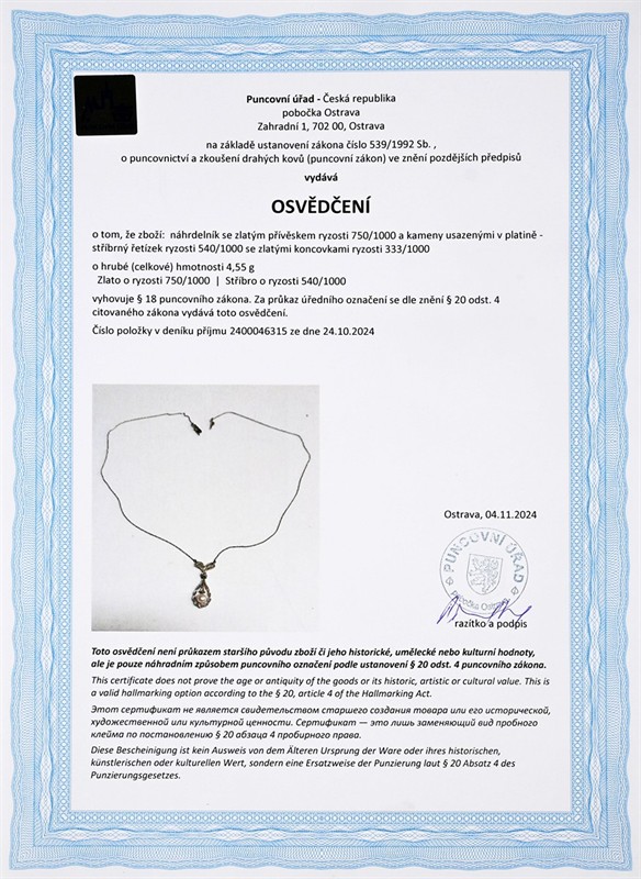 Zlato o ryzosti 750/1000 a kameny usazenými v platině stříbrný řetízek ryzosti 540/1000 se zlatými koncovkami ryzosti 333/1000 váha 4,55 g diamantové routy perla Akoya výška přívěsku 2,9 cm délka řetízku 44 výborný stav osvědčení puncovního úřadu kameny s garancí pravosti zkontrolované v gemologické laboratoři