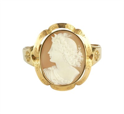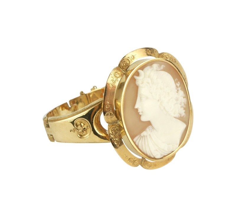 Klasicisní zlatý náramek s kamejí z mušloviny, západní Evropa, kolem roku 1830, zlato o ryzosti 520/1000 o celkové hmotnosti 21,20 g, průměr náramku: 6 cm. Rozměry zlaté ozdoby s kamejí: 5 x 4,5 cm, rozměry kameje: 3,5 x 3 cm. Atest Puncovního úřadu.