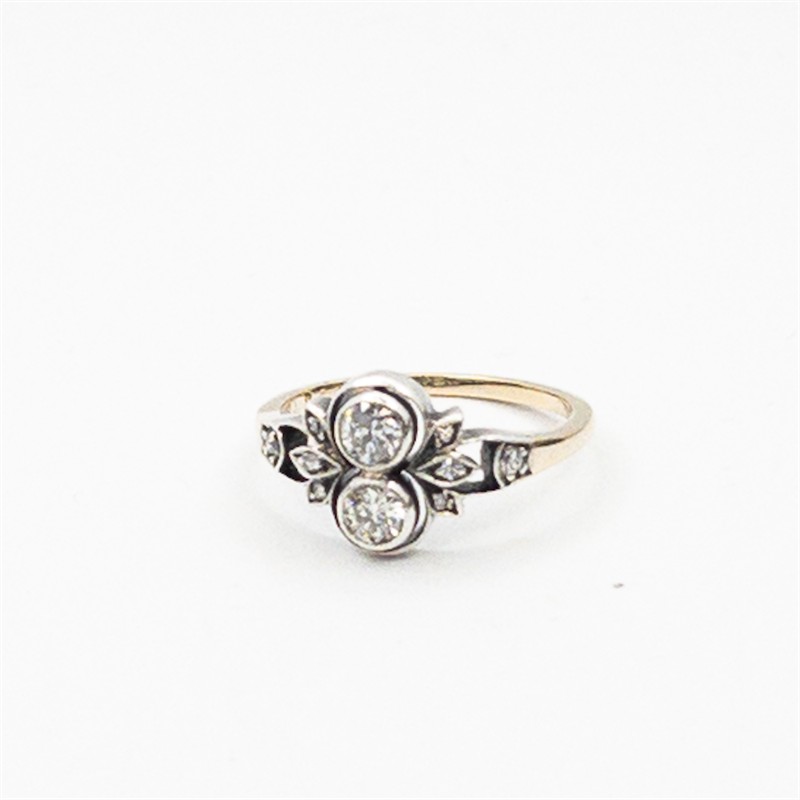 Starožitný zlatý prsten z první třetiny 20. století je osazený přírodními diamanty starého briliantového brusu0,45 ct, Rakousko - Uhersko, zlato o ryzosti 14 karátů 580/1000 o celkové hmotnosti 2,45 g, velikost prstenu 52