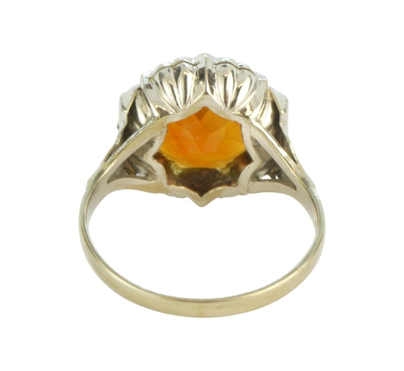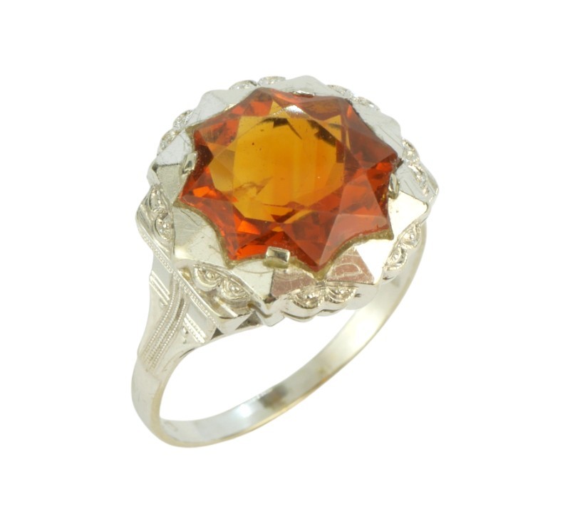 Velmi elegantní starožitný prsten z bílého zlata je osazený přírodním citrínem zářivé, hnědooranžové barvy o hmotnosti 4,3 ct, hlava prstenu kolem osazení kamene je velmi pěkně řemeslně zpracovaná, průměr je cca 1,5 cm, prsten byl vyroben ve 20.- 30. letech 20. století, v období Art Deco a je puncován puncem z období První republiky, bílé zlato o ryzosti 14 karátů 585/1000 o celkové hmotnosti 3,40 g, velikost prstenu 55.