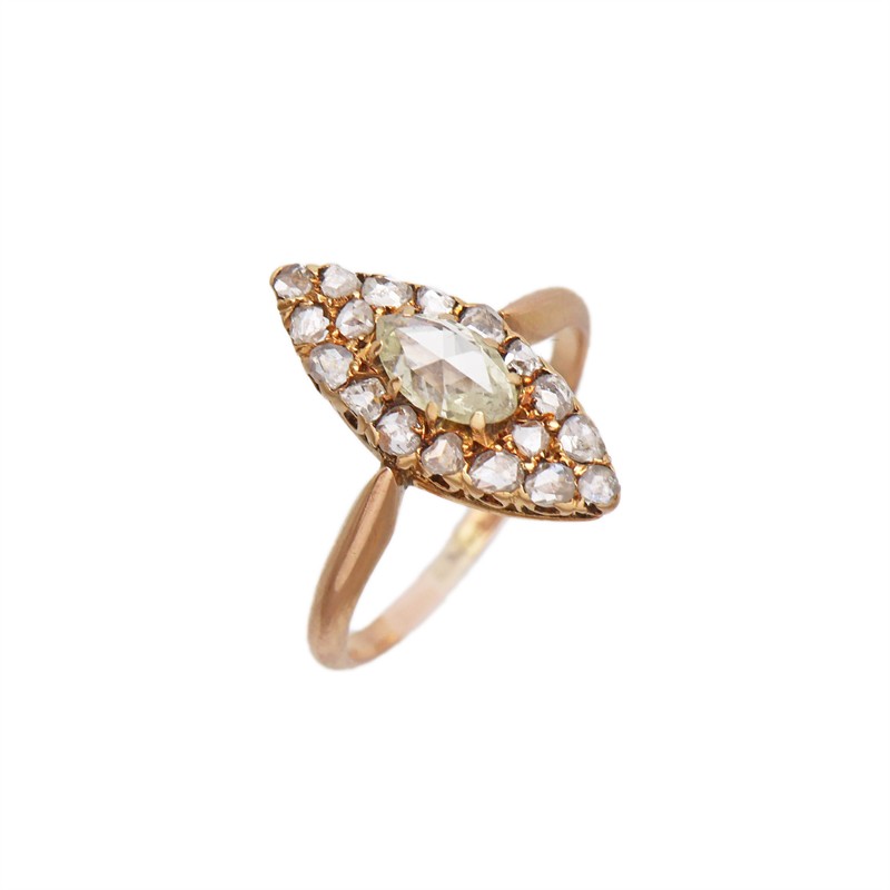 Zlatý prsten, 585/1000, celková hmotnost 2,54 g | Přírodní diamanty | Rakousko Uherská práce | Rok 1880 | Velikost prstenu 53 | Velikost hlavy 1,9 x 0,7 cm | Výborný stav | Kameny zkontrolovány v gemologické laboratoři