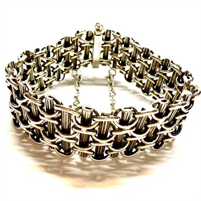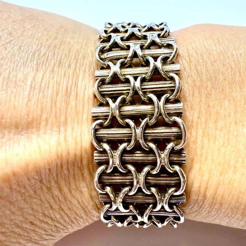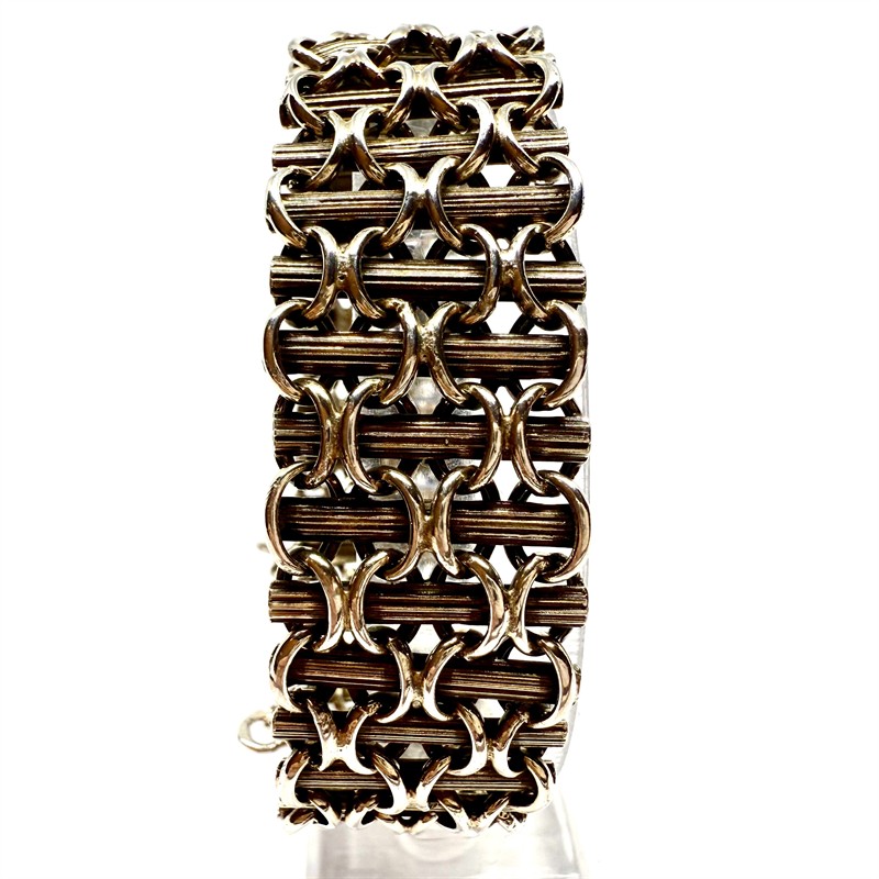 Nevšedně proplétaný, velmi starý náramek nadčasového designu. Šperk byl zhotoven ze stříbra ryzosti 750/1000 a označen původním, dobovým puncem - hlava lvice. Nevšední kombinace decentně zlacených vertikálních dílů se stříbrnými oky. Celková váha 29,83. Šířka 1,8 cm, délka 17,5 cm. Pojistný řetízek, ztracené zapínání jako součást náramku. Perfektní stav. Vzhledem k délce 17,5 cm, je šperk vhodný spíše na štíhlé zápěstí.