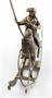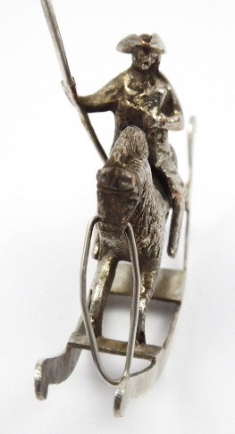 Postříbřená měď a mosaz. Pravděpodobný výrobce: Firma Gebrüder Dingeldein založená roku 1868 v německém Hanau. Figura jezdce na koni z postříbřené mědi a mosazi umístěná na stylizované kolébce. Jezdec drží v pravé ruce praporec. Značeno: nezřetelné značky na boku ohlávky. Německo, Hanau ?, minulé století. Výška s praporcem 9 cm, šířka 7 cm.