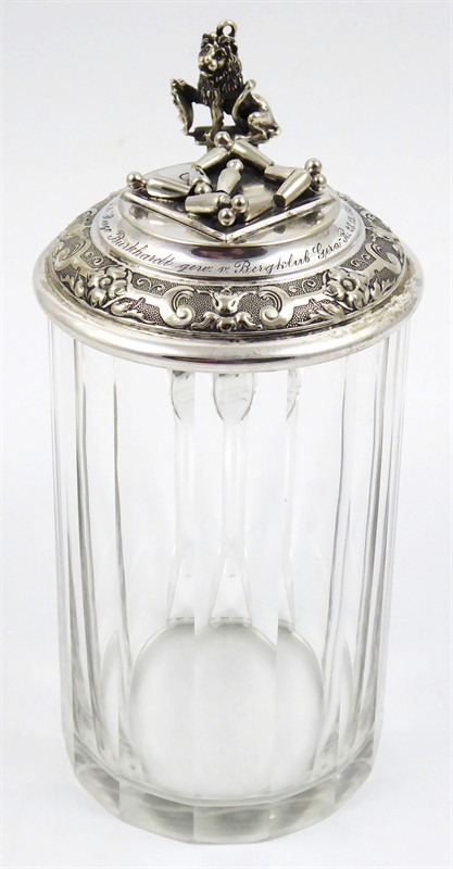 Postříbřená mosaz - alpaka, bezbarvé broušené sklo. Výrobce víka s úchytem: Württembergische Metallwarenfabrik (WMF), Geislingen. Skleněný korbel s broušenými svislými fazetami a postříbřeným víkem s okružím. Centrální část víka dekorovaná reliéfními kuželkami. Okraj s gravírovanými a gilošovanými ornamenty spolu s gravírovaným věnováním v němčině, přeloženo jako: Panu Hugo Burkhardtovi věnováno od Bergclubu Gera (sportovní kuželkářský klub) s datem 28.12.1923. Úchyt zakončen figurou lva držícího štít či erb. Značeno: firemní značka WMF, písmeno N (Neusilber, I/0 síla postříbření a značka X (oxidující). Německo, Geislingen, kolem roku 1923. Výška 17 cm.