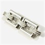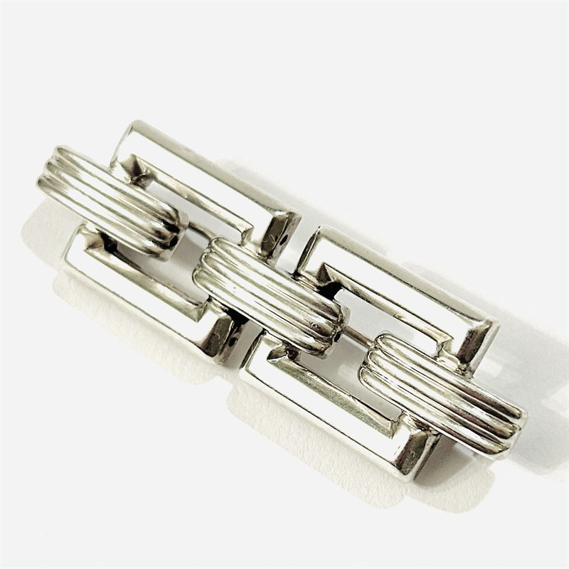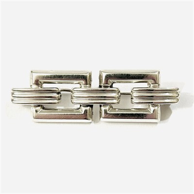 Elegantní brož z období art-deco, jejíž tělo je tvořeno schématem náramkové vazby s geometricky pojatými články. Kvalitní tuzemská zlatnická práce z 30. let 20. století. Zhotoveno z nezlaceného stříbra o ryzosti 900/1000; prvorepublikový punc S-46 (slovenské trojvrší 3) a ryzostní číslo na jehle. Hmotnost 8,17 g, délka 55,5 mm, šířka 17 mm. Zapínání včetně trombónové pojistky v pořádku, z přední strany nepatrná promáčklina, celkově v zachovalém stavu.