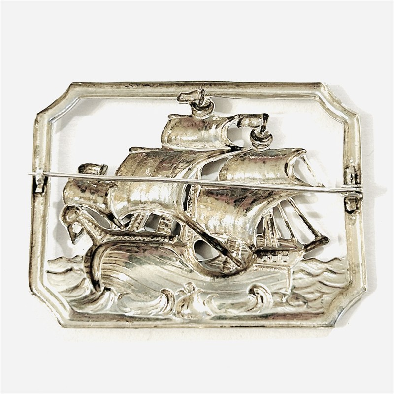 Výrazná obdélná brož z období art-deco s výjevem stylizované historické plachetnice na rozvlněném moři. Plasticky provedeno s četnými průhledy. Tematický šperk s v minulosti oblíbeným námětem, tuzemská zlatnická práce z let 1941-1945. Vyrobeno technikou perforovaného plechu. Zhotoveno z nezlaceného stříbra o ryzosti 800/1000; protektorátní punc S-53 (šachovnice 5) zezadu. Hmotnost 12,60 g, délka 60 mm, šířka 45 mm. Zapínání na "C" sponu v pořádku, celkově v zachovalém stavu, odborně vyčištěno a vyleštěno zlatníkem.