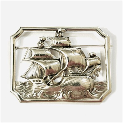 Výrazná obdélná brož z období art-deco s výjevem stylizované historické plachetnice na rozvlněném moři. Plasticky provedeno s četnými průhledy. Tematický šperk s historicky oblíbeným námětem, práce pražského klenotníka Antonína Novotného z let 1941-1945. Vyrobeno technikou perforovaného plechu. Zhotoveno z nezlaceného stříbra o ryzosti 800/1000; protektorátní punc S-53 (šachovnice 5), ryzostní číslo a mistrovská značka "AN" zepředu a na jehle. Hmotnost 11,91 g, délka 60 mm, šířka 45,5 mm. Zapínání na "C" sponu v pořádku, celkově ve velmi zachovalém stavu, odborně vyčištěno a vyleštěno zlatníkem.