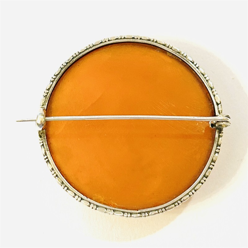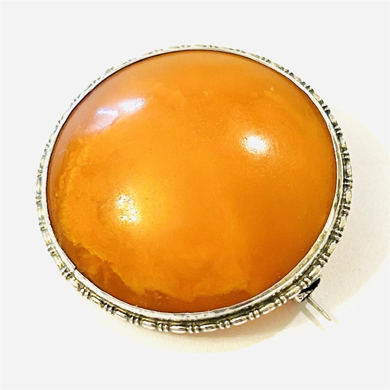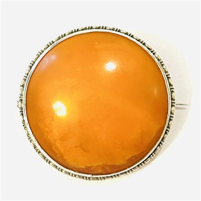 Větší brož z období art-deco, jíž vévodí nadstandardně velká kulatá plošší mugle přírodního oranžového mléčného jantaru, decentně rámováno perlovcem. Kvalitní středoevropská práce z 30. let 20. století. Zhotoveno z nezlaceného stříbra o ryzosti 925/1000, zapínací háček o ryzosti 800/1000; vyhotoveno osvědčení puncovního úřadu, neznačeno. Hmotnost 9,10 g, průměr 41 mm. Zapínání na "C" sponu v pořádku, nově měněná jehla, celkově v zachovalém stavu, odborně vyčištěno a vyleštěno zlatníkem.
