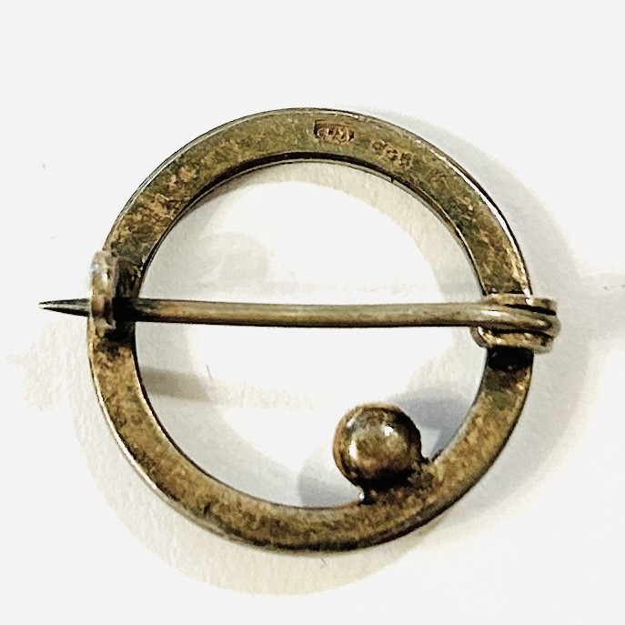 Půvabná menší kruhová brož z období art-deco, rám osazen zářivými zelenými kameny čtvercového brusu, při vnitřní hraně doplněno bílo-šedou umělou voskovanou perlou. Nadčasový design, patrně německá zlatnická práce z 20. až 30. let 20. století. Zhotoveno z nezlaceného stříbra o ryzosti 800/1000; ryzostní číslo a značka výrobce "WP" zezadu. Hmotnost 2,16 g, průměr 19,5 mm. Zapínání na "C" sponu v pořádku, ponecháno s přirozenou patinou, celkově ve velmi zachovalém stavu.