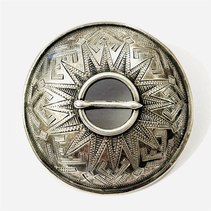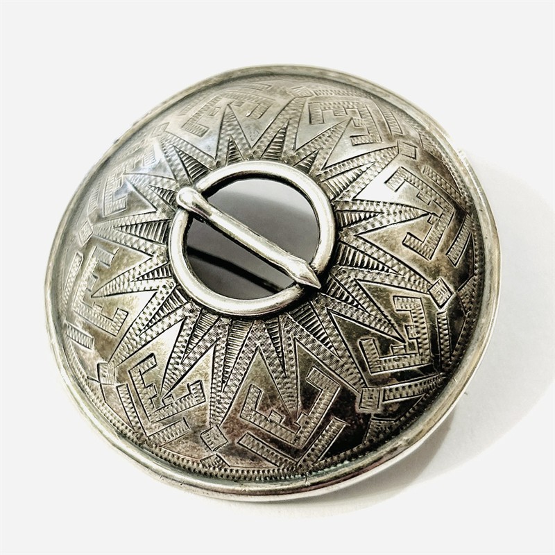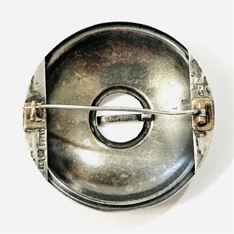 Větší, etnická brož ve tvaru oděvní spony, tzv. "solg" typické pro oblast dnešního Estonka a Finská. Kupolovité tělo se středovým trnem, povrch zdoben geometrickým gravírováním. Finská zlatnická práce ze 3. čtvrtiny 20. století. Tělo a jehla zhotoveny z nezlaceného stříbra o ryzosti 813/1000, spona a pant z obecného kovu; nově opatřeno puncem S-69 (zajíc 5) na jehle, finský punc "koruna", ryzostní číslo a značka zespoda, nově označeno "METAL" na sponě. Hmotnost 8,98 g, průměr 45,5 mm. Zapínání na “C“ sponu v pořádku, ponecháno s přirozenou patinou, lze vyčistit, celkově v zachovalém stavu.