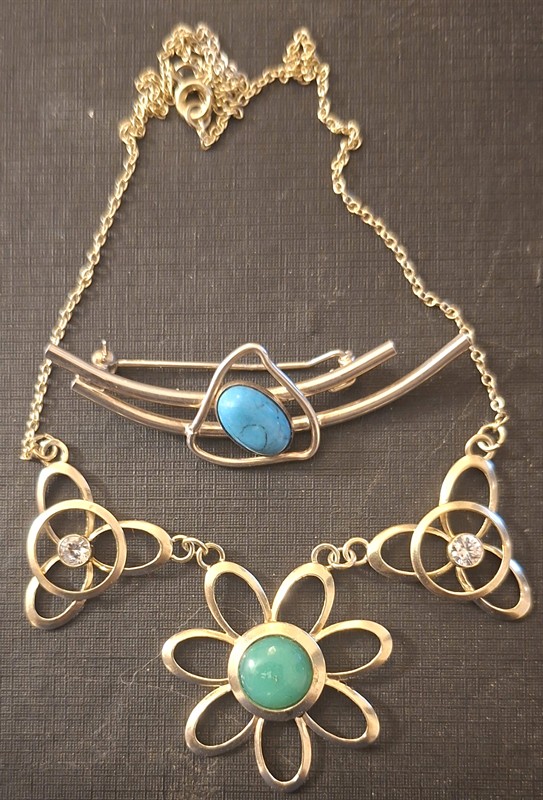 - Abstraktní brož s tyrkysem, 6 x 2 cm, hmotnost , stříbro 900/1000, značeno, puncováno - Kolier s centrálním květem se zeleným kamenem, stříbro 900/1000, 401 cm, značeno, puncováno