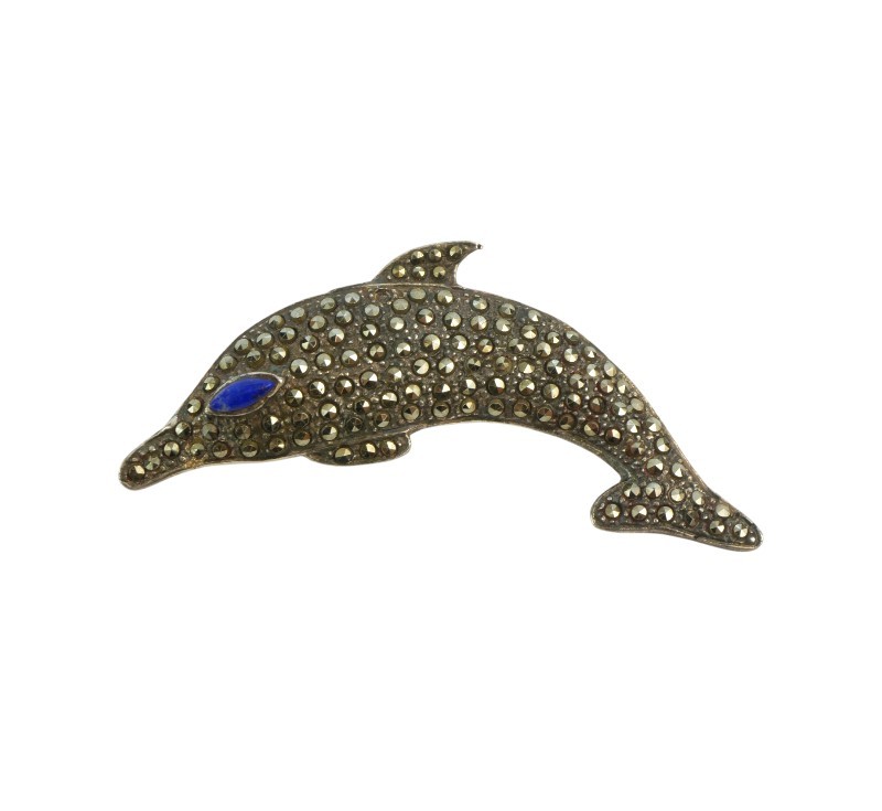 Stříbrná brož delfín ve tvaru delfína, celé tělo je zdobeno markazity a oko je z lapis lazuli. Šperk zhotovený na počátku 20.století ze sterlingového stříbra (925/1000) Celková hmotnost 8,45 g. Rozměry 5,4 x 1,8 cm. Velmi dobrý stav.