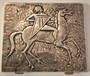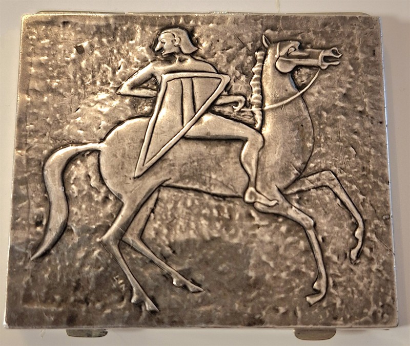 Brož - přívěs stříbro 900/1000, puncováno (trojúhelník 3), první polovina 40. let, rozměr 7,5 x 4,5 cm, hmotnost 19 g Dárková krabička z obecného kovu, na víčku doplněná stříbrným plechem s rytinou jezdce na koni, značeno „LIN“ tj obchodní značka společnosti Lin Bren (USA), výrobce uměleckých doplňků osobní potřeby, art deco, 40.léta m.s., rozměr 7 x 6,2 x 0,8 cm