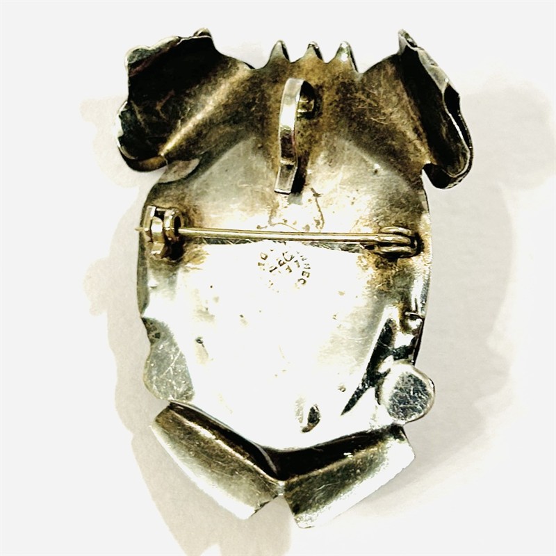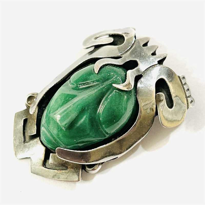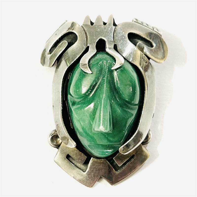 Nevšední, extravagantní brož ve tvaru aztécké masky, obličej ruční glyptikou z přírodního jadeitu, rámování v podobě rituální koruny. Kvalitní mexická zlatnická a řezačská práce z 3. čtvrtiny 20. století. Zhotoveno z nezlaceného stříbra o ryzosti 925/1000, jehla z obecného kovu; nově opatřeno puncem S-61 (kozlík 2) na háčku a značkou "METAL" na jehle, značení výrobce zezadu. Hmotnost 18,86 g, délka 49 mm šířka 39 mm. Zapínání včetně pojistky v pořádku, otevřený háček pro zavěšení na řetízek. Ponecháno s přirozenou patinou, lze vyčistit, stopy nošení, jinak v dobrém stavu.