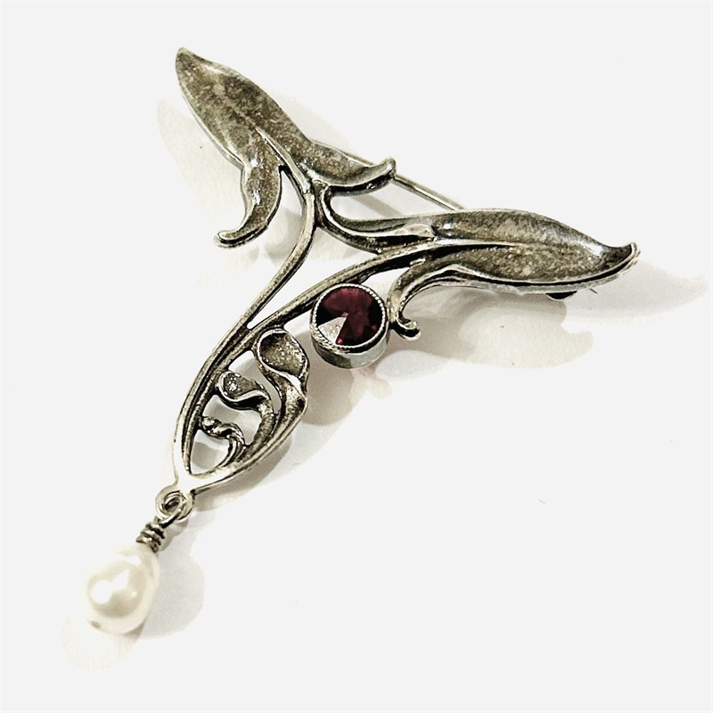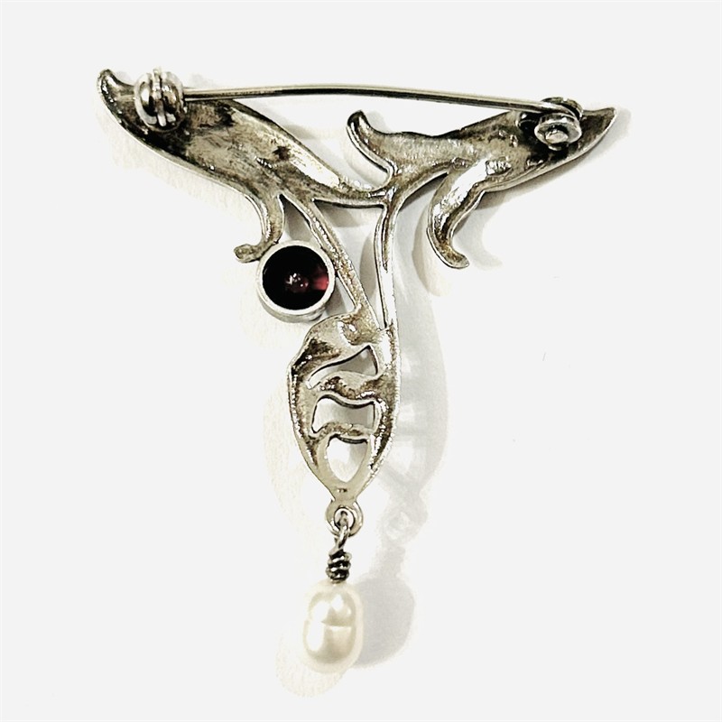 Originální, půvabná brož v secesním stylu inspirovaná dobovými návrhy. Florální stylizované tělo je osazeno českým granátem hvězdicového brusu fasovaném v zrnité obrubě, dole ověsek z přírodní bílé říční perly. Pražská autorská práce z dílny Norberta Riegla z první čtvrtiny 21. století. Zhotoveno z umělě patinovaného stříbra o ryzosti 900/1000; punc S-6Z (zajíc 3) a mistrovská značka “NR“ zezadu. Hmotnost 4,15 g, celková 43 mm, šířka 38 mm. Zapínání včetně pojistky v pořádku, nikdy nenošeno, stav nový, tedy intaktní.